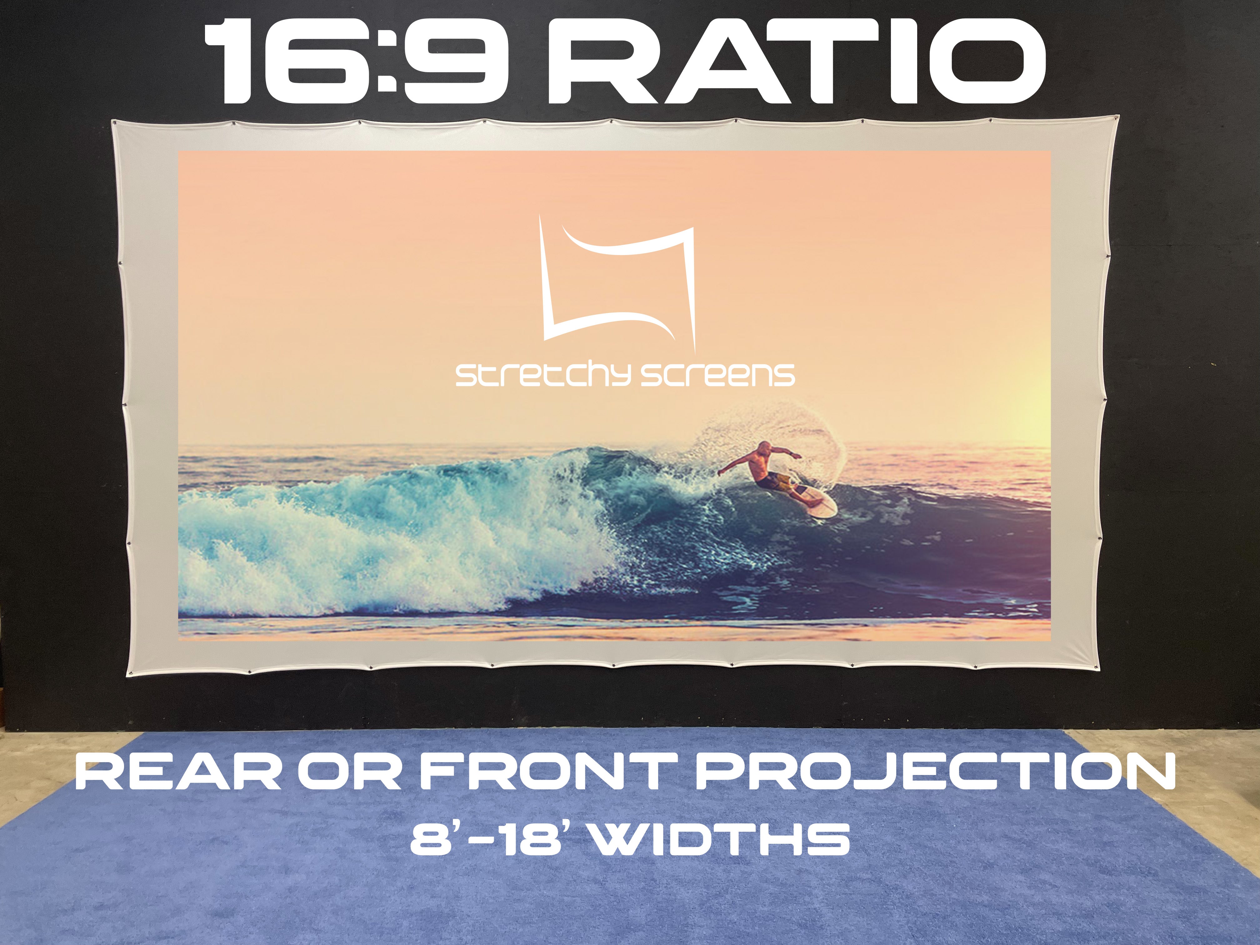 Stretchy Screens’ projection screens are ideal for concert graphics, DJ backdrops, church backdrops, expos, nightclubs, movies, advertisements, and more. Every one of our products is American-made at our local shop in Michigan. We ship our products all around the nation and the world. What you’ll find below is a selection of our premade projection screens. Read the product descriptions to see each product’s available dimensions, specs, and information about mounting and shipping. Some screens come with a frame or truss, but most do not. If you need framing too, simply match your desired screen dimensions to one of our framing or trussing options We always provide the bungee cords and simple directions for easy setup. Don’t see the exact screen you’re looking for? No problem. We can create an innovative, affordable custom order for you! Learn more about our custom order process.